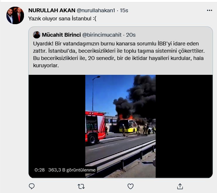 Yerel Seçimlerde İstanbul ve Ankara başta olmak üzere elinde bulundurduğu bir çok ili kaybeden AKP, seçim sonuçlarından sonra sürdürdüğü kumpas politikalarına devam ediyor. AKP'li Mücahit Birinci sosyal medya hesabından İstanbul'da geçmişte yanan otobüsün görüntülerini bugünmüş gibi paylaşarak İBB'yi suçladı.
