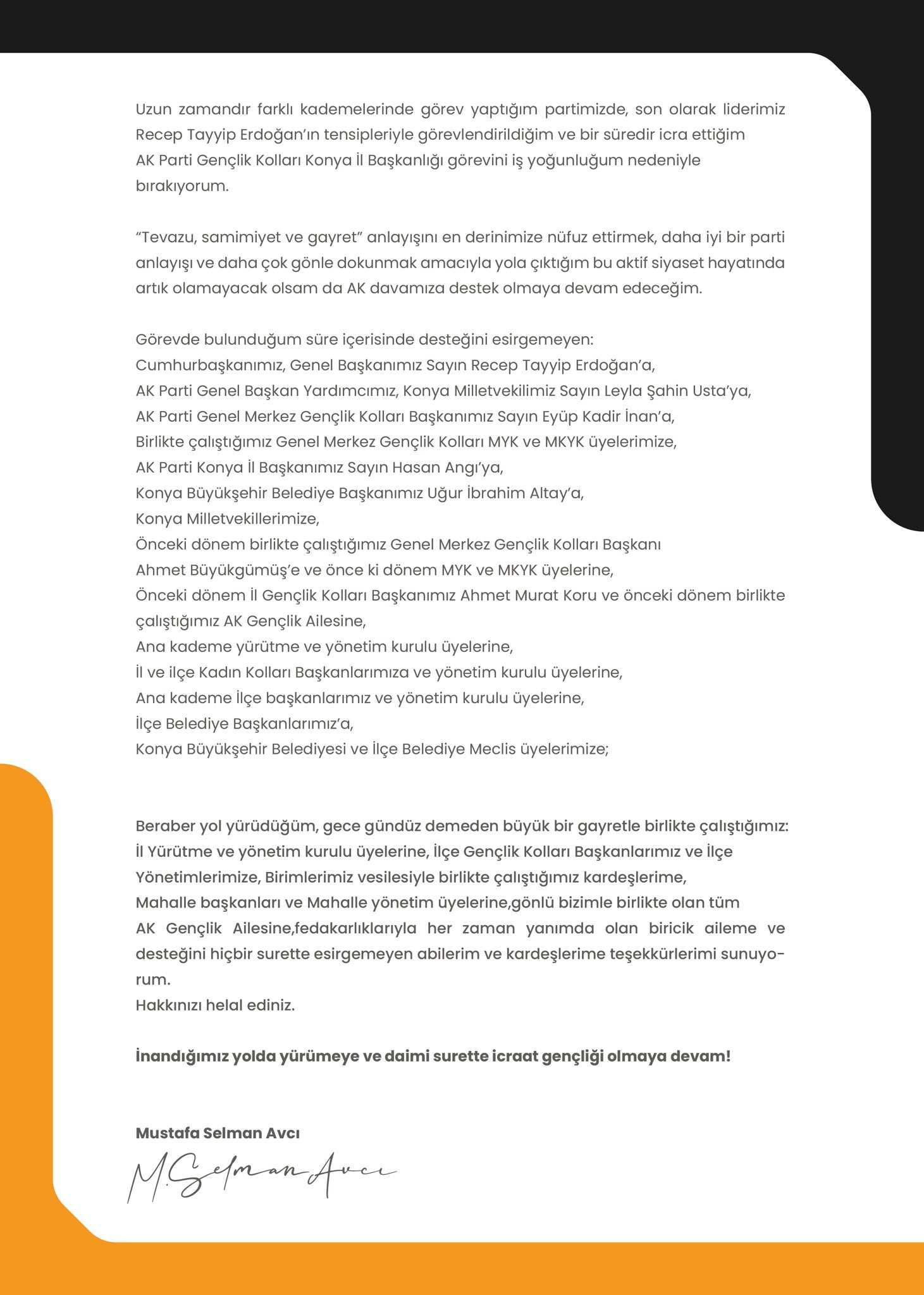 AKP Konya Gençlik Kolları Başkanı Mustafa Selman Avcı istifa etti. Göreve geçtiğimiz yılın Şubat ayında getirilen Avcı, istifasını sosyal medyadan duyurdu.
