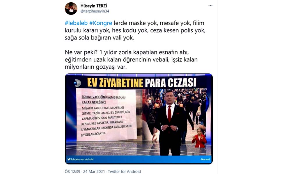 Sağlık çalışanları canhıraş çalışırken, esnaf kepenk kapatırken, müzisyenler çaresizlikten canına kıyarken Erdoğan'ın sosyal mesafenin hiçe sayıldığı kalabalık kongresi büyük tepki çekti.