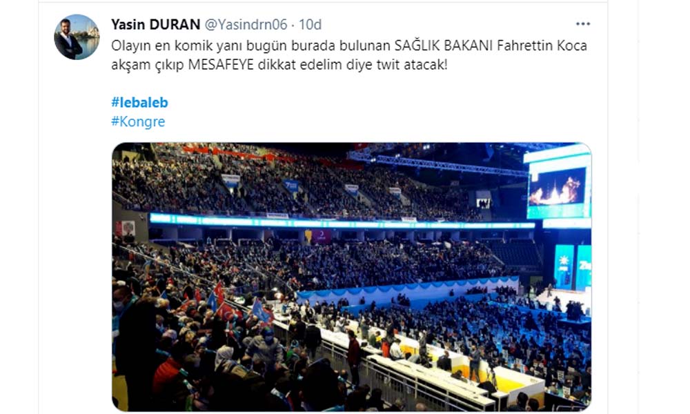 Türkiye Covid-19 pandemisiyle mücadele ederken AKP'li Cumhurbaşkanı Erdoğan bugün yine tıklım tıklım dolu salonda kongre yaptı, yurdun dört bir yanından vatandaşları Ankara'da toplattı. https://tele1.com.tr/turkiye-3-piki-konusuyor-akpliler-kongreye-kosuyor-353088/ Pandemi döneminde AKP kongresinin 'korkunç' kalabalığına sanatçılardan, siyasilerden ve yurttaşlardan büyük tepki geldi. Tepkilerden bazıları şöyle: