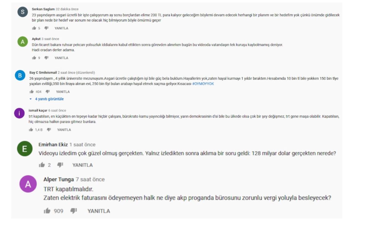 TRT Haber'in YouTube kanalındaki ve Twitter'da tepkilerden bazıları şöyle: