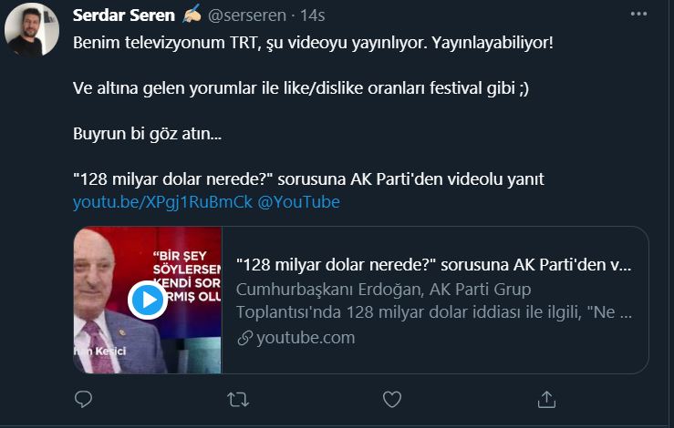 AKP'nin CHP'nin Merkez Bankası rezervleriyle ilgili “128 milyar dolar nerede?” sorusuna yanıt olarak hazırladığı ve AKP'li Cumhurbaşkanı Recep Tayyip Erdoğan'ın TBMM grup toplantısında izlettiği video, TRT Haber'in YouTube kanalında yayınlandı. https://tele1.com.tr/iste-erdogan-ve-akplilerin-celiskili-128-milyar-dolar-aciklamalari-374982/ Devlet televizyonu olan TRT'nin AKP'nin propaganda videosunu yayınlaması sosyal medya platformlarında çok sayıda kullanıcının tepkisini çekti. 4 binin üzerindeki yorumlarda hükümet de eleştirildi. TRT Haber'in YouTube kanalındaki ve Twitter'da tepkilerden bazıları şöyle: