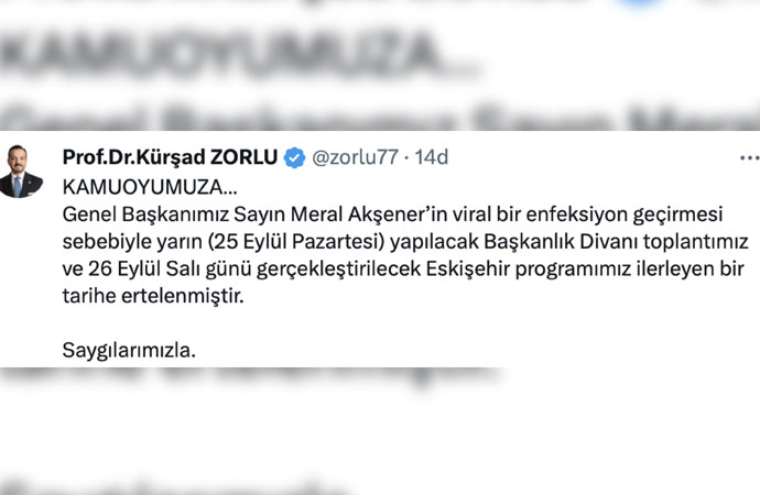 "Genel Başkanımız Sayın Meral Akşener’in viral bir enfeksiyon geçirmesi sebebiyle yarın (25 Eylül Pazartesi) yapılacak Başkanlık Divanı toplantımız ve 26 Eylül Salı günü gerçekleştirilecek Eskişehir programımız ilerleyen bir tarihe ertelenmiştir."