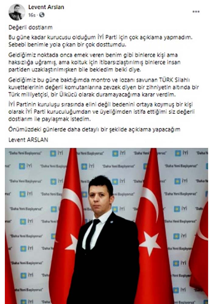 Akşener'in 103 emekli amirallerin yayınladığı bildiriyle ilgili kullandığı 'zevzeklik' ifadesi sonrası İYİ Parti Karasu İlçe Teşkilatı Kurucu Başkanı Levent Arslan, partisinden istifa ettiğini açıkladı.