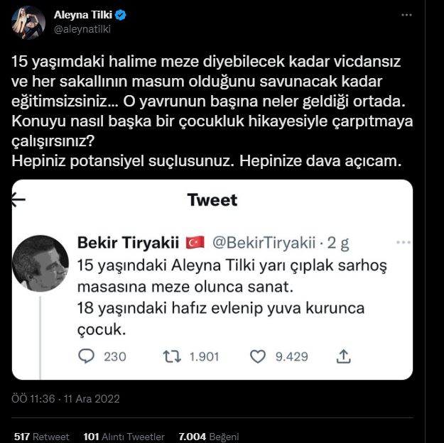 İsmailağa Cemaati'ne bağlı Hiranur Vakfı'nın kurucusu Yusuf Ziya Gümüşel'in, kızını 6 yaşındayken 29 yaşındaki adamla evlendirmesine tepkiler sürerken bir sosyal medya kullanıcısı konuyu şarkıcı Aleyna Tilki'ye getirdi. Hiranur Vakfı’nın kurucusu Yusuf Ziya Gümüşel’in, kızını 6 yaşındayken 29 yaşındaki adamla evlendirmesine tepki çığ gibi büyüyorken Twitter’da ‘Bekir Tiryaki’ adlı hesaptan “15 yaşındaki Aleyna Tilki yarı çıplak sarhoş masasına meze olunca sanat. 18 yaşındaki hafız evlenip yuva kurunca çocuk” diye mesaj atıldı.“HEPİNİZ POTANSİYEL SUÇLUSUNUZ”