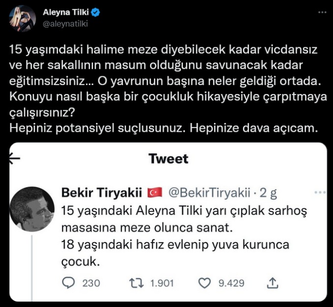 Şarkıcı Aleyna Tilki, Twitter'da 15 yaşındaki halini 'meze' olarak hedef alıp çocuk istismarını örtmeye çalışan bir sosyal medya kullancısına tepki gösterdi. Aleyna Tilki şunları dile getirdi: