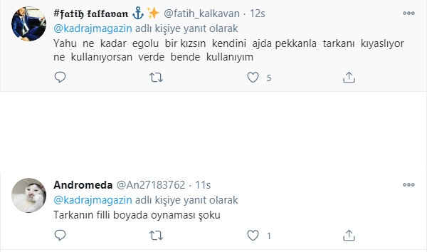 Genç şarkıcı Aleyna Tilki yaptığı açıklamayla ortalığı karıştırdı. Son olarak Exxen'de İşte Bu Benim Masalım'da Cemal Can Canseven ile başrolleri paylaşan Tilki, bir parfüm firmasından gelen reklam teklifini farklı bir dille reddetti. Aleyna Tilki, bir parfüm firmasından gelen reklam teklifini “Eğer bir gün Tarkan ya da Ajda Pekkan bir parfüm reklamında oynarsa bu konuyu o zaman düşünebilirim.” yanıtıyla reddetti. Tilki’nin bu sözleri sosyal medya kullanıcıları tarafından ağır eleştirilere neden oldu. İlk olarak Yetenek Sizsiniz yarışmasına katılan ve orada söylediği şarkıyla tanınanİ şarkıcı Aleyna Tilki şimdilerde Acun Ilıcalı’nın Exxen platformunda İşte Bu Benim Masalım dizisinde oynuyor. İşte sosyal medyada Tilki'nin cevabına verilen tepkiler:
