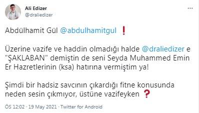 "Abdülhamit Gül! Üzerine vazife ve haddin olmadığı halde Dr. Ali Edizer'e 'ŞAKLABAN' demiştin de seni Seyda Muhammed Emin Er Hazretlerinin (ksa) hatırına vermiştim ya! Şimdi bir hadsiz savcının çıkardığı fitne konusunda neden sesin çıkmıyor, üstüne vazifeyken?"