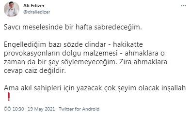 Edizer, konuyla ilgili bir başka paylaşımında da "Savcı meselesinde bir hafta sabredeceğim. Engellediğim bazı sözde dindar - hakikatte provokasyonların dolgu malzemesi - ahmaklara o zaman da bir şey söylemeyeceğim. Zira ahmaklara cevap caiz değildir. Ama akıl sahipleri için yazacak çok şeyim olacak inşallah!" ifadesini kullandı.