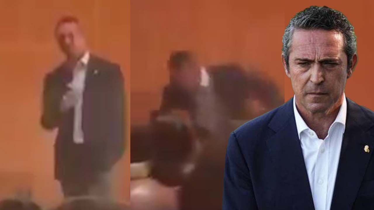 Koç, burada konuşma yaptığı sırada dengesini kaybederek yere düştü. Talihsiz kaza sonrası hemen ayağa kalkan Koç, konuşmasına kaldığı yerden devam etti.