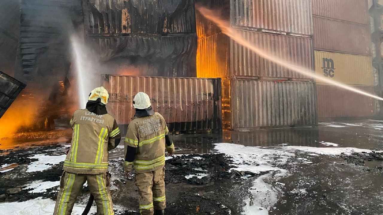 "İhbar üzerine İzmir Büyükşehir Belediyesi İtfaiye Dairesi Başkanlığı ekipleri 10 arazöz, 4 tonaj araç, 2 endüstriyel araç ve çok sayıda personel ile olay yerine sevk edildi. İzmir Büyükşehir Belediyesinden ve ilçe belediyelerinden gelen su tankerleri de söndürme çalışmalarına destek verdi. Yapılan incelemelerde, yanan konteynerlerde balık yağı bulunduğu ve alevlerin bölgeyi hızla sardığı belirlendi. Aynı zamanda otluk alana da sıçradığı belirlenen alevler, İzmir Büyükşehir Belediyesi İtfaiyesi ve Orman Bölge Müdürlüğü ekipleri tarafından kontrol altına alındı."