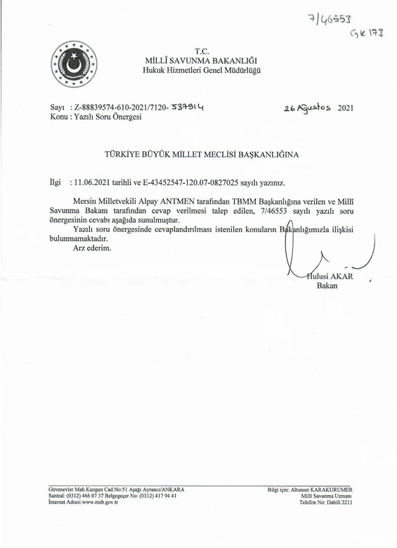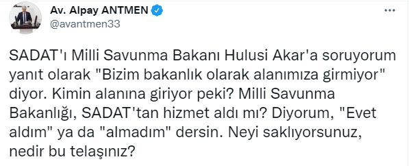 CHP Mersin Milletvekili Alpay Antmen, Twitter hesabından yaptığı paylaşımda MSB'ye yönelttiği SADAT'tan hizmet alındı mı sorusuna yanıt alamadığını ifade etti. Antmen'in Twitter'dan yaptığı paylaşım şöyle: "SADAT'ı Milli Savunma Bakanı Hulusi Akar'a soruyorum yanıt olarak "Bizim bakanlık olarak alanımıza girmiyor" diyor. Kimin alanına giriyor peki? Milli Savunma Bakanlığı, SADAT'tan hizmet aldı mı? Diyorum, "Evet aldım" ya da "almadım" dersin. Neyi saklıyorsunuz, nedir bu telaşınız?"