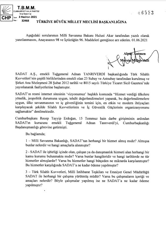 CHP Milletvekili Alpay Antmen, Milli Savunma Bakanlığı'na  sorduğu "SADAT'tan hizmet alındı mı?" sorusuna "Alanımıza girmiyor" yanıtını aldı.