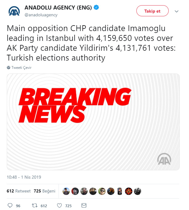 AA, Türkçe sayfalarında hala AKP'nin önde olduğunu gösterirken İngilizce yayın yaptığı Twitter sayfasında CHP adayı Ekrem İmamoğlu'nun önde olduğunu duyurdu.