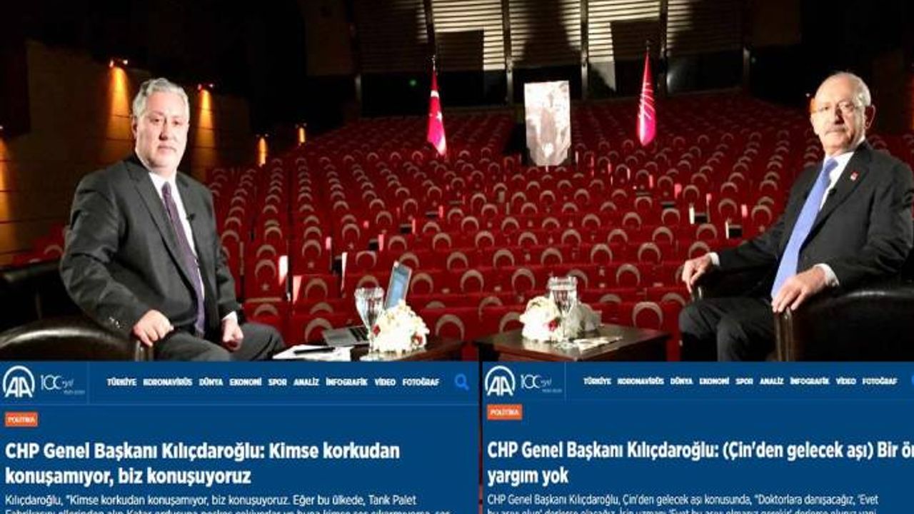 Anadolu Ajansı'nın (AA), CHP Genel Başkanı Kemal Kılıçdaroğlu'nun bugünkü söyleşisini önce uzun versiyonuyla, daha sonra başlığı değiştirip bazı bölümleri çıkararak servis ettiği ortaya çıktı.