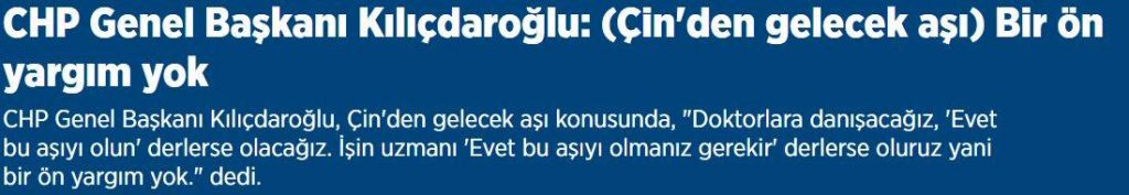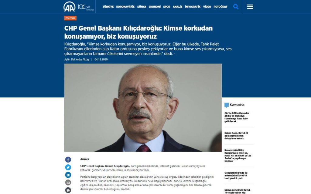 CHP Genel Başkanı Kemal Kılıçdaroğlu, T24'ten gazeteci Murat Sabuncu'nun sorularını yanıtladı. Devletin resmi haber ajansı Anadolu Ajansı, Kılıçdaroğlu'nun Sabuncu ile yaptığı söyleşiyi önce uzun versiyonuyla daha sonra başlığı değiştirip bazı bölümleri çıkarak servis etti. T24'ten Candan Yıldız'ın haberine göre, AA'da açıklamalarla ilgili süreç şöyle işledi: Anadolu Ajansı, ilk geçtiği haberde Kemal Kılıçdaroğlu'nun gazeteci Murat Sabuncu'nun sorularına verdiği yanıtlara geniş yer verdi. Haberin ilk versiyonunda "CHP Genel Başkanı Kılıçdaroğlu: Kimse korkudan konuşamıyor, biz konuşuyoruz" başlığı kullanıldı. Daha sonra değiştirilen başlıkta ise "CHP Genel Başkanı Kılıçdaroğlu: (Çin'den gelecek aşı) Bir ön yargım yok" manşeti kullanıldı. Haberin uzun versiyonunda Anadolu Ajansı, 27 Kasım’da Yargıtay’a üye olarak seçilen eski İstanbul Başsavcısı İrfan Fidan'ın, Yargıtay 12. Ceza Dairesi’nde görevlendirilmesinden birkaç gün sonra Anayasa Mahkemesi'ne üyeliği açıklamasıyla ilgili CHP liderinin "En büyük intihalcilerden birisidir Fidan" açıklamasını ara başlık olarak kullandı. AA daha sonra, haberin kısaltılmış versiyonunda Fidan'la ilgili bölümü kullanmadı; "Şu anda Yargıtay'da vicdan sahibi hakimlerin büyük kısmı rahatsız" ara başlığını korudu. Sonradan çıkarılan bölümde Kılıçdaroğlu Fidan için "Yargıya güven duyulur mu? AYM kararını en alttaki mahkeme uygulamadı. Bu, ‘Ben gücümü Saray’dan alıyorum. Hukuktan almıyorum. İlerde beni terfi edecek, bir yerlere getirecek kişiden alıyorum. Gücümü talimatlardan alıyorum’ demek oluyor. Ne oluyor? Yargıtay üyesi oluyor. Birisi AYM üyesi olacak. En büyük intihalcilerden birisidir. Siz bunu Yargıtay üyesi yaptınız. İntihal suç mu suç" demişti. CHP lideri Kılıçdaroğlu'nun, "Kimse korkudan konuşamıyor, biz konuşuyoruz" sözleri de Anadolu Ajansı'nın sonradan yenilediği haberde yer almadı. (T24) https://tele1.com.tr/kilicdaroglu-suikast-iddialariyla-ilgili-ilk-kez-konustu-280493/