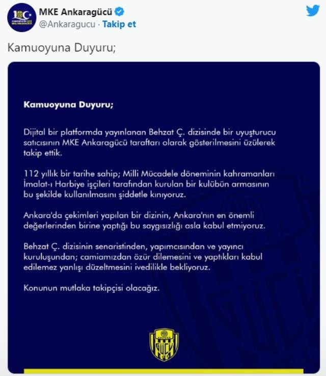 "Dijital bir platformda yayınlanan Behzat Ç. dizisinde bir uyuşturucu satıcısının MKE Ankaragücü taraftarı olarak gösterilmesini üzülerek takip ettik. 112 yıllık bir tarihe sahip; Milli Mücadele döneminin kahramanları Imalat-ı Harbiye işçileri tarafından kurulan bir kulübün armasının bu şekilde kullanılmasını şiddetle kınıyoruz. Ankara'da çekimleri yapılan bir dizinin, Ankara'nın en önemli değerlerinden birine yaptığı bu saygısızlığı asla kabul etmiyoruz. Behzat Ç. dizisinin senaristinden, yapımcısından ve yayıncı kuruluşundan; camiamızdan özür dilemesini ve yaptıkları kabul edilemez yanlışı düzeltmesini ivedilikle bekliyoruz.