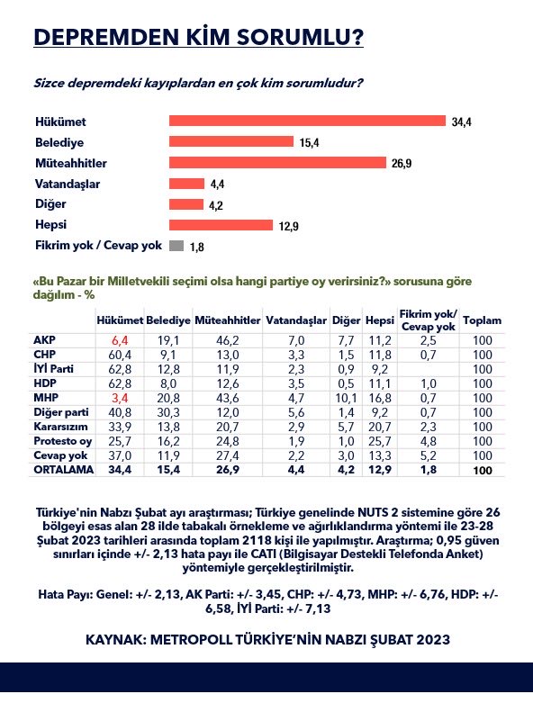 Metropoll Araştırma'nın 'depremden kim sorumlu' başlıklı anketinde yurttaşların yüzde 34,4'ü hükümetin, yüzde 15,4'ü Belediye'nin, yüzde 25,9'u da müteahhitlerin sorumlu olduğu düşüncesini dile getirdi. Ankette görüş bildiren kişilerin, siyasi tercihine göre dağılımda ise çarpıcı sonuçlar ortaya çıktı. AKP'ye ve MHP'ye oy veren kişilerin büyük bir çoğunluğu, felaketteki ölümlerde hükümetin değil müteahhitlerin sorumlu olduğu görüşünü paylaştı. CHP, İYİ Parti, HDP ve diğer parti seçmenleri sorumluluğun hükümette olduğu görüşünde. Metropoll'ün paylaştığı veriler şöyle:
