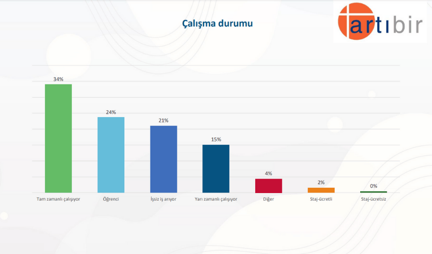 Araştırmaya göre, gençlerin yüzde 21 işsiz / iş arıyor, yüze 15’i ise yarı zamanlı çalışıyor. Gençlerin yaklaşık yüzde 40’ının sosyal güvencesi yok. Ankete katılan gençlerin sadece yüzde 34'ü tam zamanlı çalışıyor.
