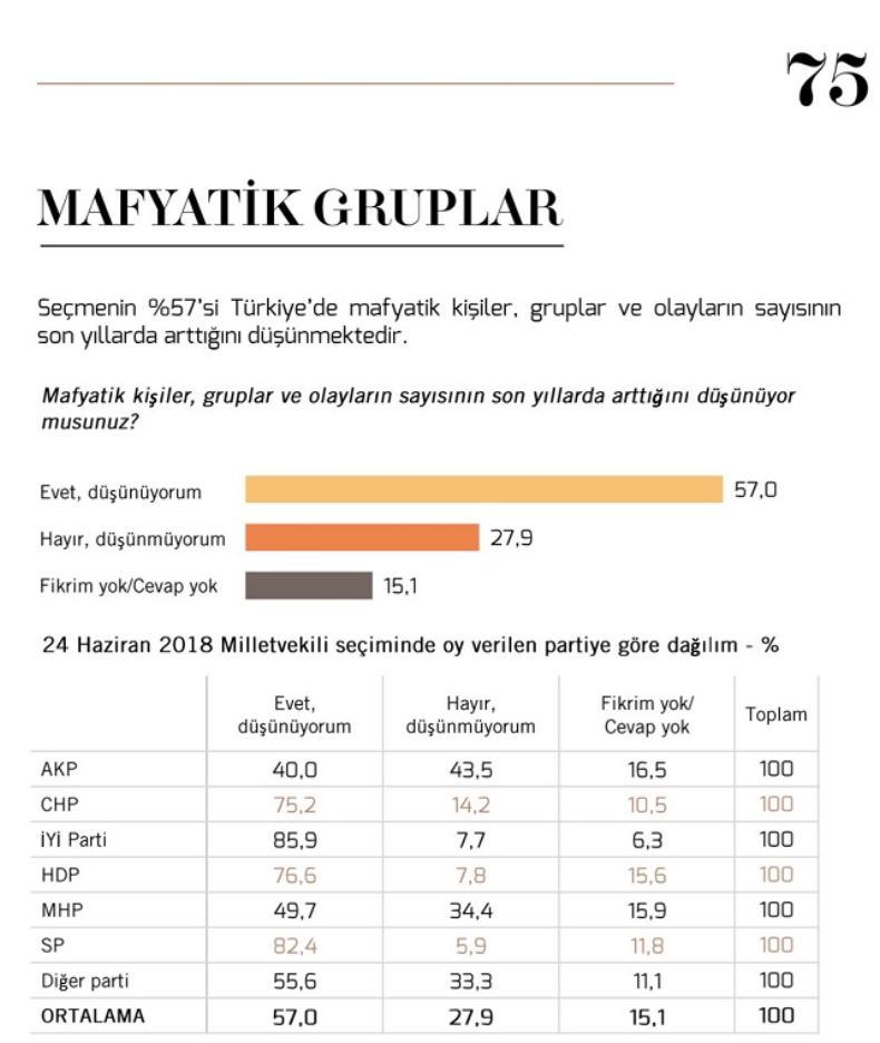 Mafyatik grupları ele alan anket sorularında seçmenin yüzde 57'si Türkiye'de mafyatik kişiler, gruplar ve olayların sayısının son yıllarda arttığını düşünüyor. Dikkat çeken anketin mafya örgütlerinin birileri tarafından korunup kollandığını düşünme oranları parti tabanında İYİ Parti’de yüzde 85 ile en yüksek oran iken AKP seçmeninin ise yüzde 44,7'si mafya örgütlerinin birileri tarafından korunup kollandığını düşünüyor. Öte yandan halkın yüzde 34'ü mafya ve suç örgütleriyle etkili mücadele edildiğini düşünürken yüzde 47'si de etkili mücadele edilmediğini ifade ediyor. Mafya ve suç örgütlerine karşı etkin mücadele edilmediğini düşünenlerin AKP seçmeni içindeki oranı ise yüzde 23,6 oldu.