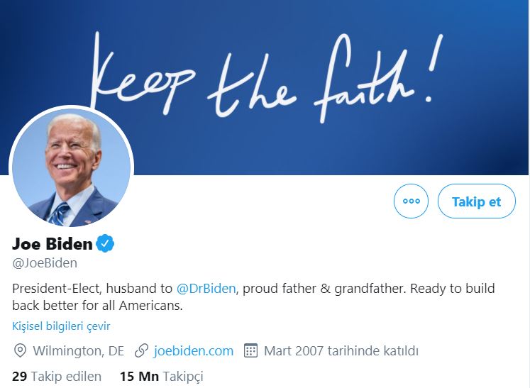 Kıyasıya yarışı kazanan Biden, resmi Twitter adresindeki biyografi bölümüne, "Seçilmiş Başkan" yazdı. Biden'ın biyografisinde, "gururlu baba" ve "büyük baba" ifadelerinin yanında, "Tüm Amerikalılar için daha iyi inşa etmeye hazır" notu da yer alıyor.