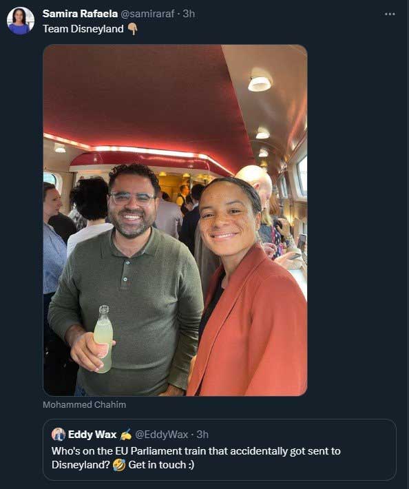 AP’deki Hollandalı milletvekili Samira Rafaela X sosyal medya platformunda, bir gazetecinin “Yanlışlıkla Disneyland’e gönderilen AP treninde kim var? Bana ulaşın” paylaşımını alıntılayarak “Disneyland takımı” yazısıyla trendeki bir fotoğrafını paylaştı.
