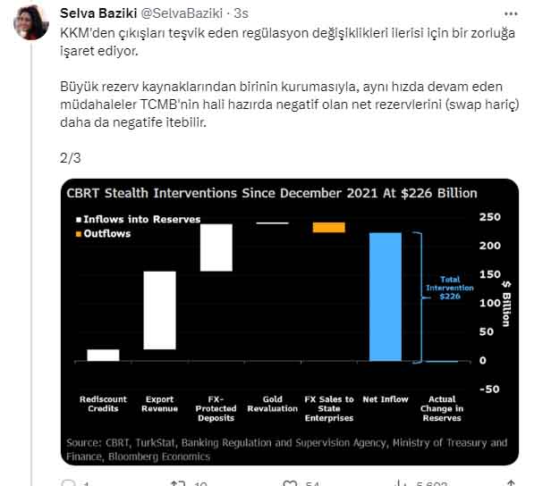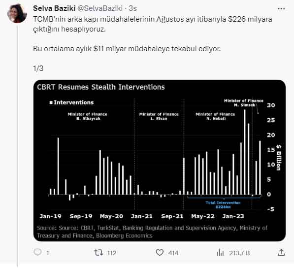 Merkez Bankası genel seçimlerin ardından ekonomi yönetiminde değişime gitti. Bu değişimle birlikte birçok eski dönem düzenlemesinde kademeli olarak değişti. Ekonomi yönetiminde değişen yöntemlere rağmen ekonomist Selva Baziki Merkez Bankası'nın arka kapı satışlarından vazgeçmedi. Baziki'nin hesaplamasına göre, Ocak 2022-Ağustos 2023 dönemindeki 20 ayda TCMB’nin döviz piyasasına müdahale amaçlı “arka kapı” satışlarının toplamı 226 milyar dolara ulaştı. Bloomberg terminalde bugün “Gizli müdahaleler geri döndü, 226 milyar dolara ulaştı” başlığıyla yayımlanan analizde, TCMB’de Gaye Erkan’ın göreve geldiği haziran ayında duran “arka kapı” satışlarının temmuz ve ağustosta yüksek hacimli olarak devam ettiği belirtildi. Analizde, Ocak 2022-Ağustos 2023 döneminde swap ve diğer dış yükümlülükler hariç net rezervlerin 224 milyar dolarlık net girişe rağmen 2 milyar dolarlık düşüş kaydettiği, bu nedenle 226 milyar dolarlık “arka kapı” müdahalesinin olduğunun tahmin edildiği aktarıldı.TEMMUZ - AĞUSTOS'TA 30 MİLYAR DOLAR SATILDI