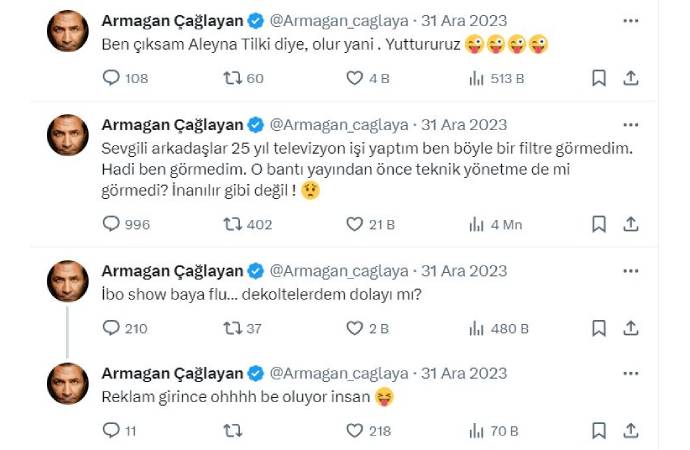Yılbaşı gecesi yayınlanan İbrahim Tatlıses'in sunuculuğunu yaptığı İbo Show'da kullanılan filtre sosyal medyanın gündemine düştü. Hülya Avşar, Aleyna Tilki, Serdar Ortaç, Şafak Sezer, Norm Ender gibi birçok ünlü ismin konuk olduğu programda kullanılan filtreden dolayı kişilerin yüzü seçilemeyecek hale geldi. Uzun yıllardır televizyon sektöründe olan televizyon yapımcısı Armağan Çağlayan, X hesabından yaptığı paylaşım ile kullanılan filtreye tepki gösterdi. Çağlayan, “Sevgili arkadaşlar 25 yıl televizyon işi yaptım ben böyle bir filtre görmedim. Hadi ben görmedim. O bantı yayından önce teknik yönetme de mi görmedi? İnanılır gibi değil! Ben çıksam Aleyna Tilki diye, olur yani . Yuttururuz” https://tele1.com.tr/armagan-caglayan-avmde-calisanlarla-kavga-etti-966563/