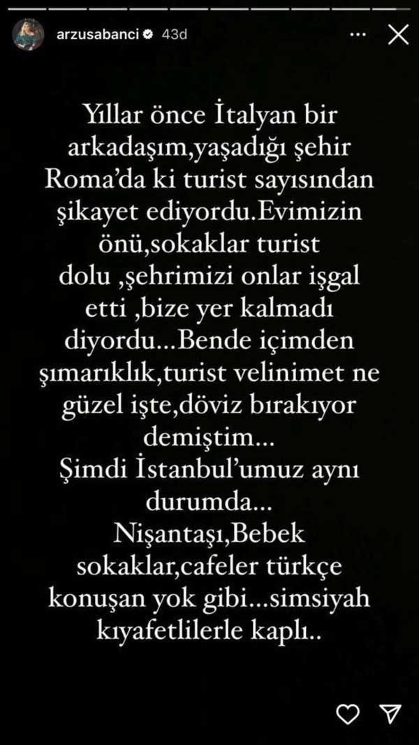 Sabancı’nın paylaşımı şu şekilde: "Yıllar önce İtalyan bir arkadaşım yaşadığı şehir Roma’daki turist sayısından şikayet ediyordu. Evimizin önü, sokaklar turist dolu, şehrimizi onlar işgal etti, bize yer kalmadı diyordu… Ben de içimden şımarıklık, turist velinimet ne güzel işte döviz bırakıyor demiştim. Şimdi İstanbulumuz aynı durumda… Nişantaşı, Bebek, sokaklar, kafeler, Türkçe konuşan yok gibi… Simsiyah kıyafetlilerle kaplı." https://tele1.com.tr/bogaz-manzarali-evinden-sikildik-demeyin-cagrisi-yapan-sabancidan-yeni-aciklama-376650/
