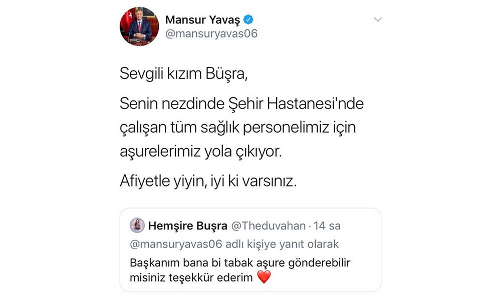 Ankara Şehir Hastanesi'nde görevli Büşra hemşire, sosyal medya hesabı üzerinden Ankara Büyükşehir Belediye Başkanı Mansur Yavaş'tan, “Başkanım bana bir tabak aşure gönderebilir misiniz teşekkür ederim” paylaşımıyla aşure istedi.