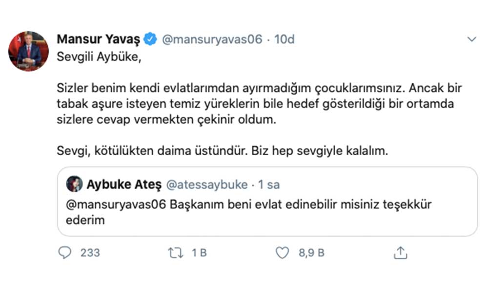 Yaşanan üzücü olayın ardından Mansur Yavaş kendisini 'evlat edinmesini' isteyen başka bir Twitter kullanıcısına şu cevabı verdi: