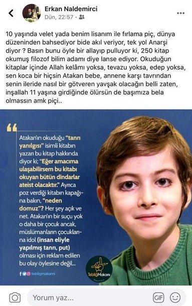 10 yaşındaki Atakan sosyal medyada yayınlanan bir video sonrası gündeme gelmiş, söylemleri, okuduğu kitapların niteliği konusunda ilgi odağı olmuştu. Atakan'ı destekleyenler dışında ona hakaret edenler, saldıranlarda olmuştu. Özyeğin Üniversitesi'nde ulaştırma görevlisi olarak çalışan Erkan Naldemirci adlı kişi, son dönemde sosyal medyada videoları yayınlanan 10 yaşındaki Atakan hakkında 'tecavüz edilmeli' ibaresini kullanan paylaşımlarda bulundu. Özyeğin Üniversitesi yönetim kadrosunda bulunan ve ulaştırma görevlisi olarak çalışan Erkan;Naldemirci adlı kişi, sosyal medya hesabından Ataka'na tepki gösterdi, bir kişinin yorumuna cevap verirken, "Buna en güzel tedavi tecavüz kardeşim" ibaresini kullanması tepkiyle karşılandı. Sosyal Medya'da Özyeğin Üniversitesi'ne ve Naldemirci'ye tepkiler arttı.ÜNİVERSİTE'DEN AÇIKLAMA "DERHAL İLİŞİĞİ KESİLMİŞTİR"