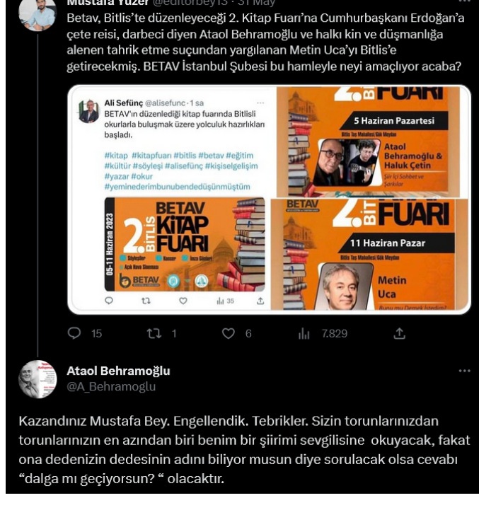 Kırmızı Bülten Genel Yayın Yönetmeni Mustafa Yüzer 31 Mayıs’ta Bitlis'teki söyleşi yapacak olan Behramoğlu'nu hedef gösterdi. Yüzer Twitter hesabından, “Bitlis Eğitim ve Tanıtma Derneği’nin (BETAV) düzenleyeceği 2. Kitap Fuarı’na Cumhurbaşkanı Erdoğan’a çete reisi, darbeci diyen Ataol Behramoğlu ve halkı kin ve düşmanlığa alenen tahrik etme suçundan yargılanan Metin Uca’yı getirecekmiş. BETAV İstanbul Şubesi bu hamleyle neyi amaçlıyor acaba?” ifadelerini kullandı.
