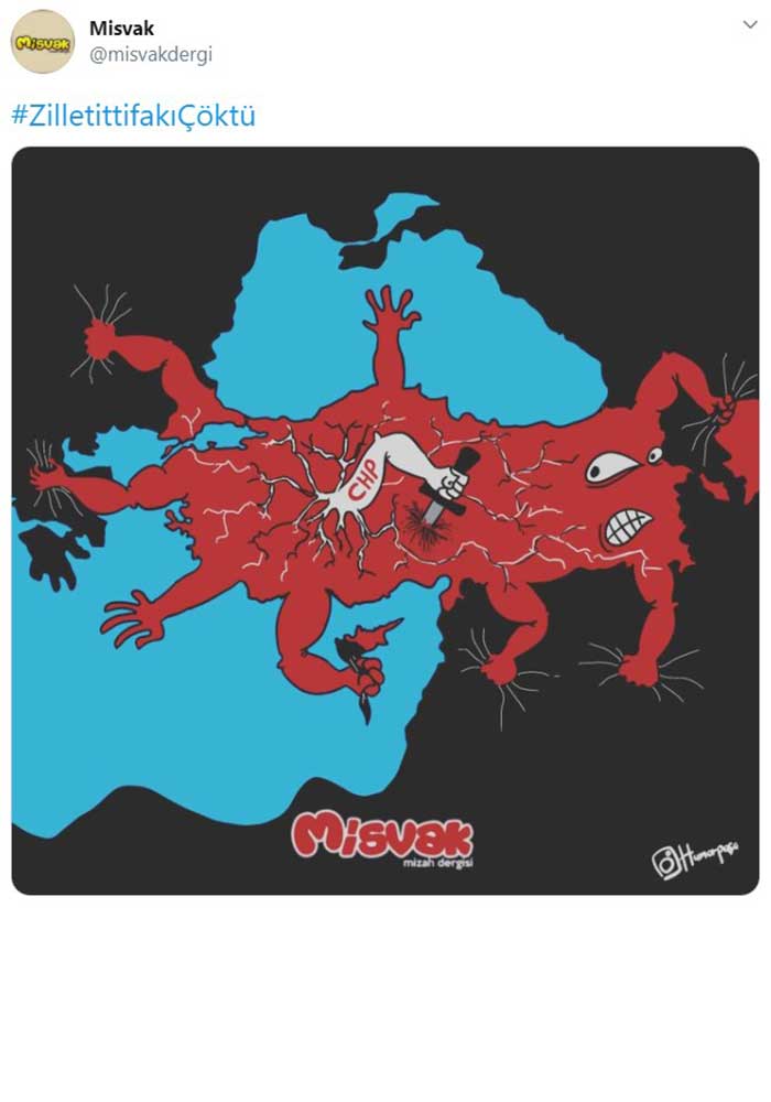 Misvak, sosyal medya hesabından Türkiye haritasının yer aldığı bir karikatürünü paylaştı. Karikatürde, elinde bıçak olan Ankara ili üzerinde “CHP” yazılı kolun, Türkiye'nin merkezine bıçak sapladığı görüldü. https://tele1.com.tr/gerici-misvak-dergisinin-hz-yusuf-karikaturu-tepki-cekti-201424/ Misvak tepki çeken karikatürü, Millet İttifakı'nı hedef alarak "#ZilletittifakıÇöktü" notuyla paylaştı.İşte tepki çeken o karikatür: