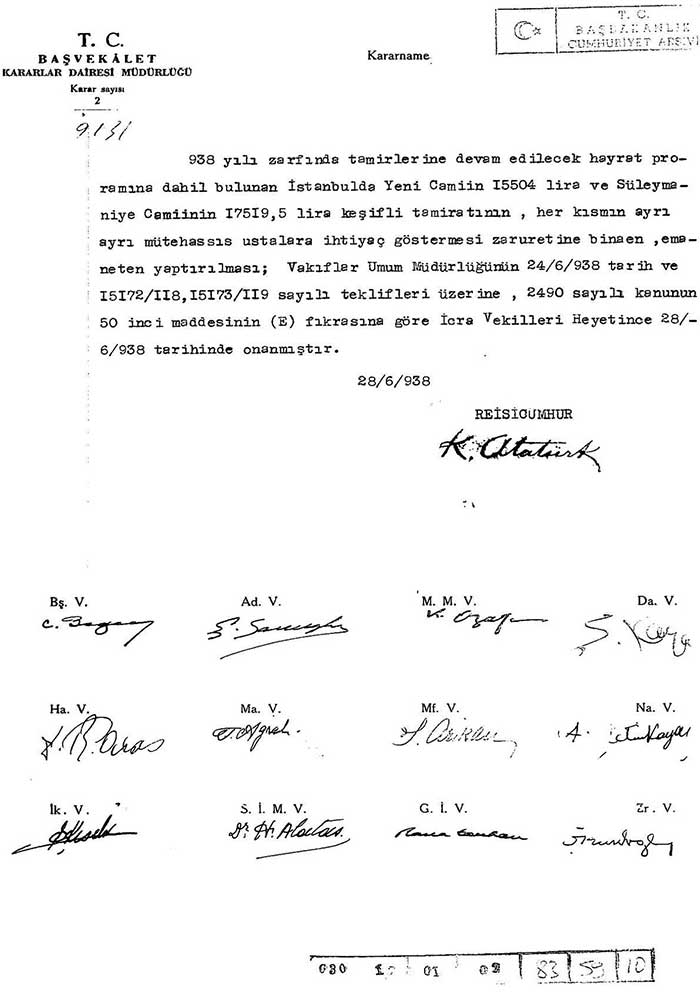 28 Haziran 1938 tarihli, Cumhurbaşkanı Atatürk imzalı Bakanlar Kurulu kararnamesiyle İstanbul'daki Yeni Cami ve Süleymaniye Camisi'nin tamiratının emaneten yaptırılmasına karar verildi.(BCA, 30.18.01.02.83.59.10)