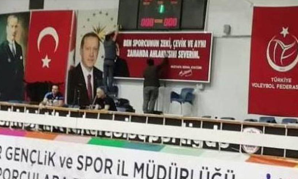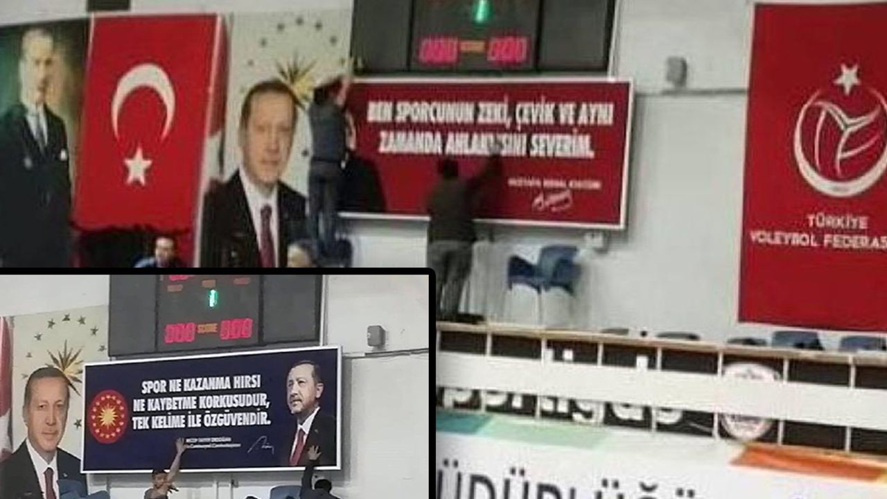 Balıkesir Kurtdereli Spor Salonu'nun duvarında Mustafa Kemal Atatürk'ün sözünün asılı olduğu afiş kaldırılarak yerine Cumhurbaşkanı Recep Tayyip Erdoğan'ın sözü asıldı.