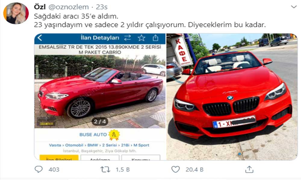 Otomobildeki ÖTV zammı gündemdeki yerini korurken Twitter'da oznozlem isimli bir kullanıcının otomobil fiyatıyla ilgili paylaşımı olay oldu.2 yıldır çalıştığını söyleyen kullanıcı, "Sağdaki aracı 35’e aldım. 23 yaşındayım ve sadece 2 yıldır çalışıyorum. Diyeceklerim bu kadar." ifadelerini kullandı. Paylaşım yüzlerce beğeni alırken, özellikle Türkiye'de senelerdir çalışıp ikinci el araç bile alamayan kişiler fiyatlara tepki gösterdi. https://tele1.com.tr/otv-zammi-akpli-trolu-bile-isyan-ettirdi-214916/