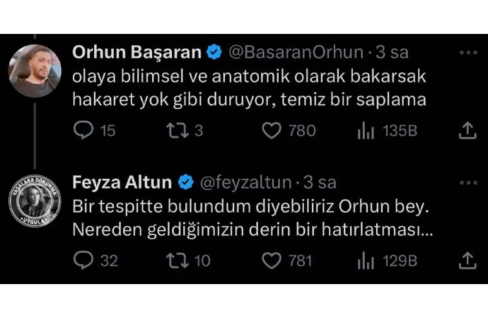 “Olaya bilimsel ve anatomik olarak bakarsak hakaret yok gibi duruyor, temiz bir saplama” şeklinde yorum yapan bir takipçisine yanıt veren Altun, “Bir tespitte bulundum diyebiliriz Orhun bey. Nereden geldiğimizin derin bir hatırlatması…” dedi.
