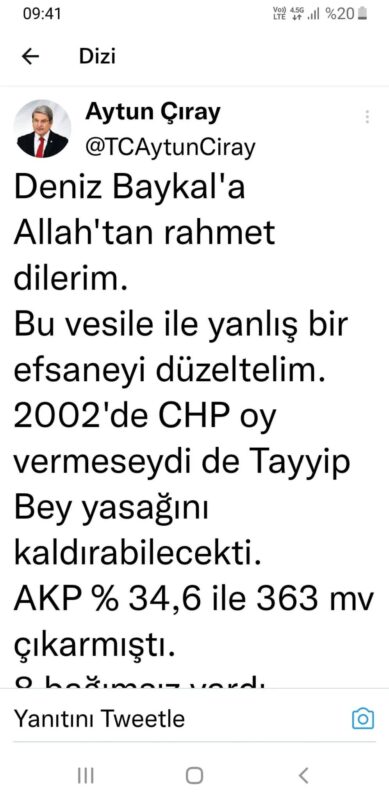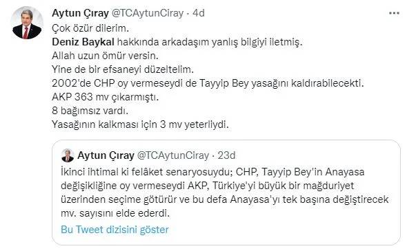 Çıray, "Çok özür dilerim. Deniz Baykal hakkında arkadaşım yanlış bilgiyi iletmiş. Allah uzun ömür versin. Yine de bir efsaneyi düzeltelim. 2002'de CHP oy vermeseydi de Tayyip Bey yasağını kaldırabilecekti. AKP 363 mv çıkarmıştı. 8 bağımsız vardı. Yasağının kalkması için 3 mv yeterliydi" ifadelerini kullandı.