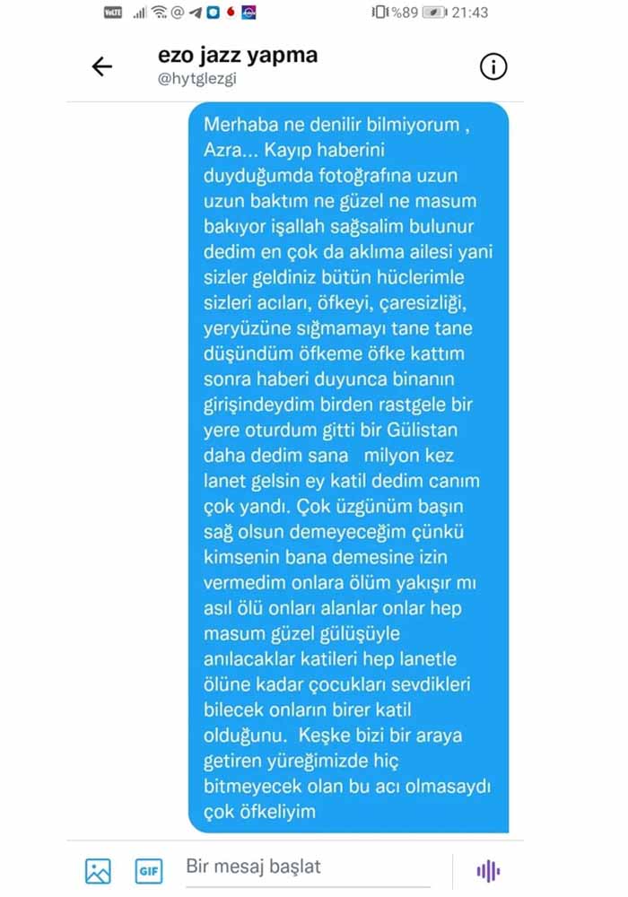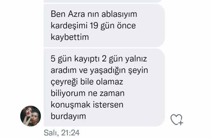 Ezgi Haytaoğlu mesajında "Ben Azra'nın ablasıyım. Kardeşimi 19 gün önce kaybettim. Beş gün kayıptı. İki gün yalnız aradım ve yaşadığın şeyin çeyreği bile olamaz biliyorum. Ne zaman konuşmak istersen buradayım..." ifadelerine yer verdi.