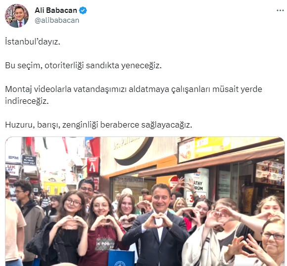 DEVA Partisi Genel Başkanı Ali Babacan, “Bu seçim, otoriterliği sandıkta yeneceğiz. Montaj videolarla vatandaşımızı aldatmaya çalışanları müsait yerde indireceğiz. Huzuru, barışı, zenginliği beraberce sağlayacağız” dedi.