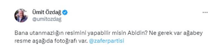 Babacan'ın açıklamalarına Zafer Partisi Genel Başkanı Ümit Özdağ'dan sert tepki geldi. Cumhurbaşkanlığı seçimlerinin ikinci turunda Millet İttifakı Adayı Kemal Kılıçdaroğlu'nu destekleyen Özdağ, Babacan'ın söz konusu paylaşımını alıntılayarak, "Bana utanmazlığın resmini yapabilir misin Abidin? Ne gerek var ağabey resme aşağıda fotoğrafı var." ifadelerini kullandı.