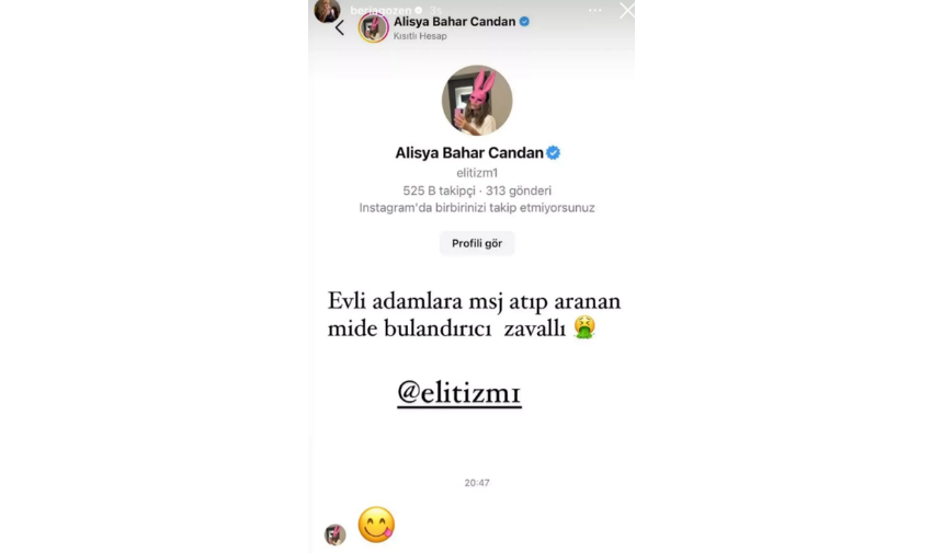 Ancak bu açıklamalar, Beria Özden’in öfkesini yatıştırmaya yetmedi. Eşine atılan mesaj ve sonrasında yapılan paylaşımlar karşısında sert ifadeler kullanan Özden, Bahar Candan’a yönelik şu sözleri dile getirdi: