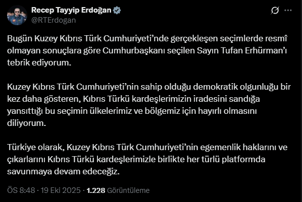 "Bugün Kuzey Kıbrıs Türk Cumhuriyeti’nde gerçekleşen seçimlerde resmî olmayan sonuçlara göre Cumhurbaşkanı seçilen Sayın Tufan Erhürman’ı tebrik ediyorum.