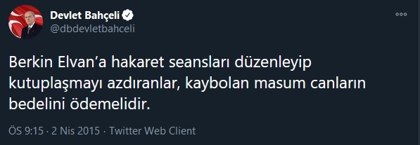Oda TV'de yer alan habere göre Bahçeli’nin bu sözlerinin ardından, Gezi Parkı eylemleri sırasında polisin silahından çıkan biber gazı kapsülüyle 15 yaşında hayatını kaybeden Berkin Elvan için attığı tweetler ortaya çıktı.