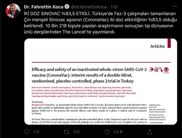 Koca şunları söyledi: "İKİ DOZ SINOVAC %83,5 ETKİLİ. Türkiye'de Faz-3 çalışmaları tamamlanan Çin menşeli Sinovac aşısının (CoronaVac) iki doz etkinliğinin %83,5 olduğu belirlendi. 10 Bin 218 kişiyle yapılan araştırmanın sonuçları tıp dünyasının ünlü dergilerinden The Lancet'te yayımlandı."