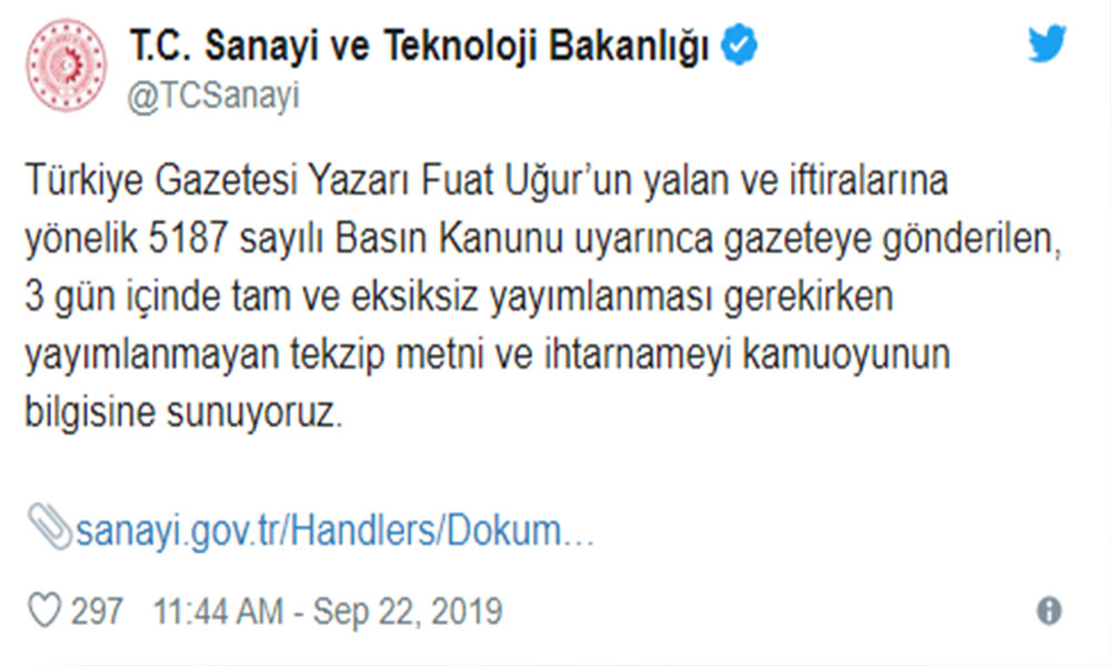 Bakanlığın 17 Eylül’de gazete gönderdiği ve üç gün içinde tam haliyle yayınlanmasını istediği tekzip metni, Uğur’un 21 Eylül tarihli köşesinde özet halinde yer buldu. Bunun üzerine bakanlık da tekzibin tam halini bugün Twitter hesabından paylaştı.