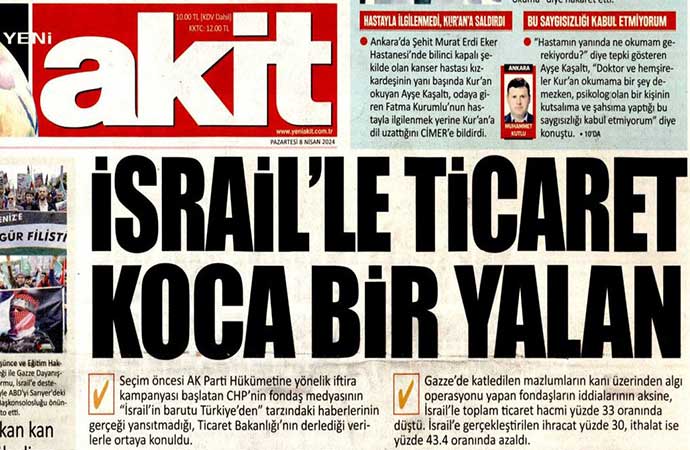 İsraille ticaret konusunda bu gelişmeler yaşanırken yandaş Yeni Akit Gazetesi ise dün “İsrail'le ticaret koca bir yalan” manşetiyle çıktı.