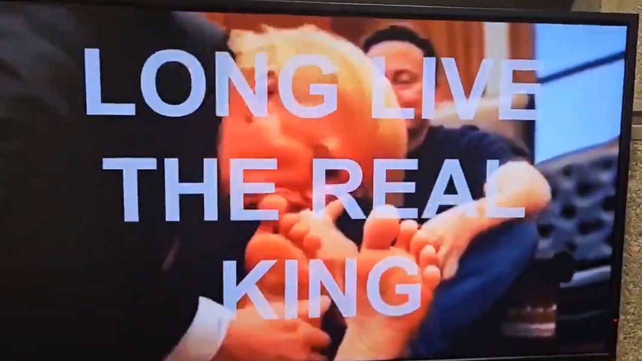 İlk olarak Vox muhabiri Rachel Cohen tarafından bildirilen olayda, ekranlarda büyük harflerle “Gerçek kral çok yaşa” mesajı da yer aldı.