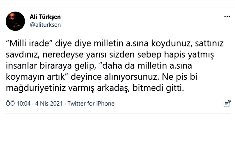 Sosyal medya hesabından açıklama yapan Türkşen, "“Milli irade” diye diye milletin a.sına koydunuz, sattınız savdınız, neredeyse yarısı sizden sebep hapis yatmış insanlar biraraya gelip, “daha da milletin a.sına koymayın artık” deyince alınıyorsunuz" diyen Türkşen, "Ne pis bi mağduriyetiniz varmış arkadaş, bitmedi gitti" ifadelerini kullandı.